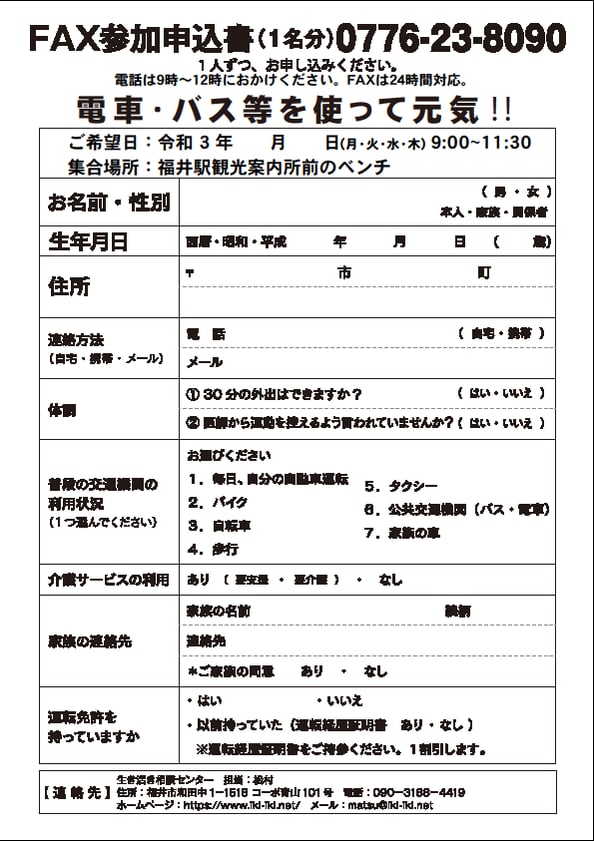 運転しなくても安全な外出へ · 30日 6月 2021 電車バスを使って元気! 参加申込書 QRコードから2名様まで、または、下記の用紙は1名ずつ記入してください。記入後、メールでお送りください。 shinia100kenkousoudan@gmail.com 「電車 バス等を使って元気!」参加申込書 20210601.pdf PDFファイル 261.6 KB ダウンロード tagPlaceholderカテゴリ: コメントをお書きください コメント: 0